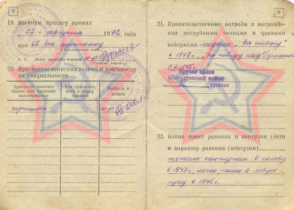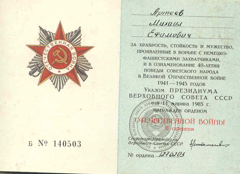 Из наградного документа: За храбрость, стойкость и мужество проявленные в борьбе с немецко-фашистскими захватчиками, и в ознаменование 40-летия Победы советского народа в Великой Отечественной войне 1941-1945 годов Указом Президиума Верховного Совета СССР от 11 марта 1985 года наградить орденом Отечественной войны 2 степени.