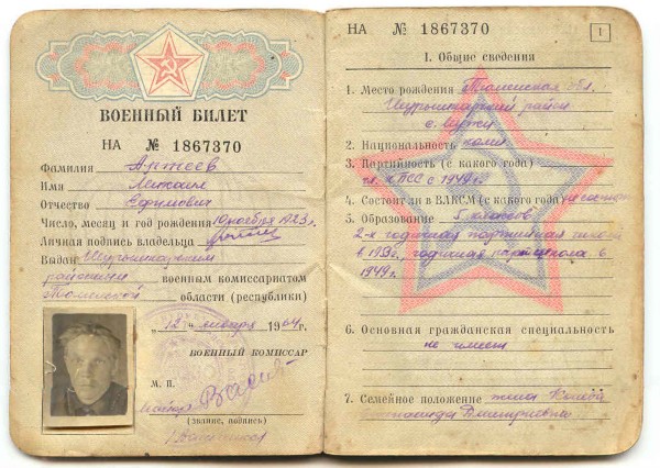 1923 г.р., уроженец с. Мужи, п. Питляр, национальность коми, член КПСС с 1949 года. сержант, стрелок. Призван в июне 1942 года Ямало-Ненецким ОВК. Направлен в часть 15 июля 1942 года. Сержант, стрелок, орудийный номер с сентября 1942 г. в составе 88 зенитно-артиллерийского полка (Ленинградский фронт), с 1943 г. в составе 3-й батареи 1119 зенитного артиллерийского полка 5 зенитной артиллерийской Братиславской Краснознаменной Ордена Кутузова дивизии Резерва Главного командования, имел легкое ранение в апреле 1945 г.