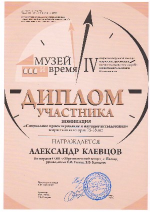 - подготовили проект для IV открытого окружного конкурса творческих, проеткных и научно-исследовательских работ имени И.С. Шеановского "Музей и время" в номинации "Социальное проектирование и научные исследования", г.Салехард, 2015 г.;