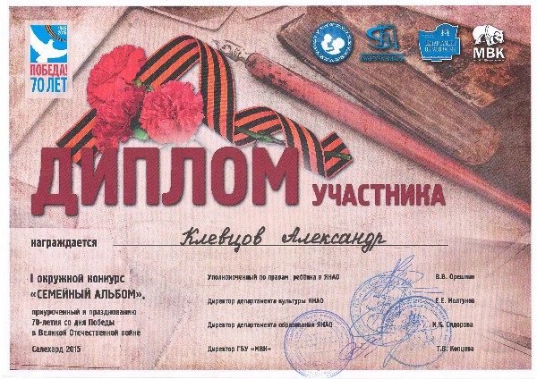 - участвовали в I окружном конкурсе "Семейный альбом", приуроченном к празднованию 70-летия со дня Победы в Великой Отечественной войне, г. салехард, 2015 г.;